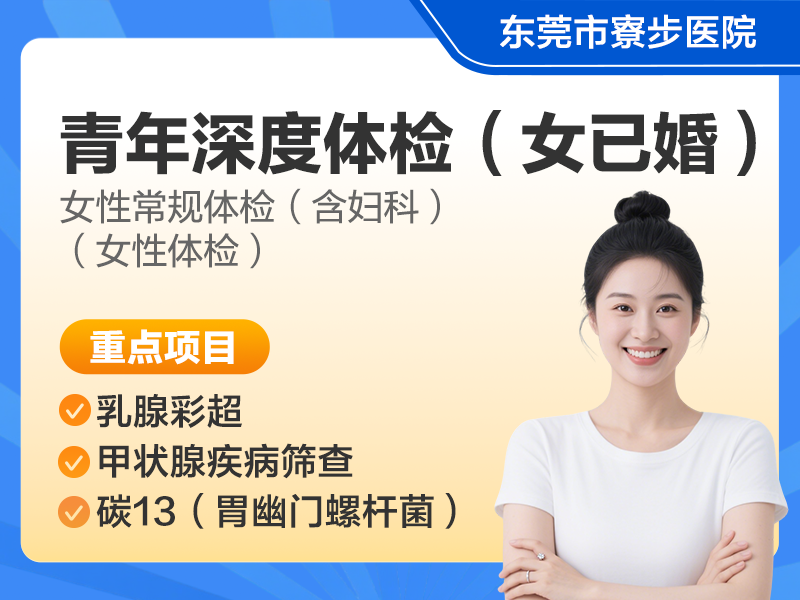 | 商品名称:青年深度体检套餐(女已婚) | 套餐类型:常规体检 | 所属品牌:东莞市寮步医院 |