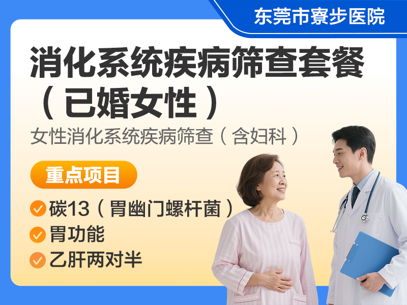 | 商品名称:消化系统疾病筛查套餐(女已婚) | 套餐类型:消化系统疾病筛查 | 所属品牌:东莞市寮步医院 |